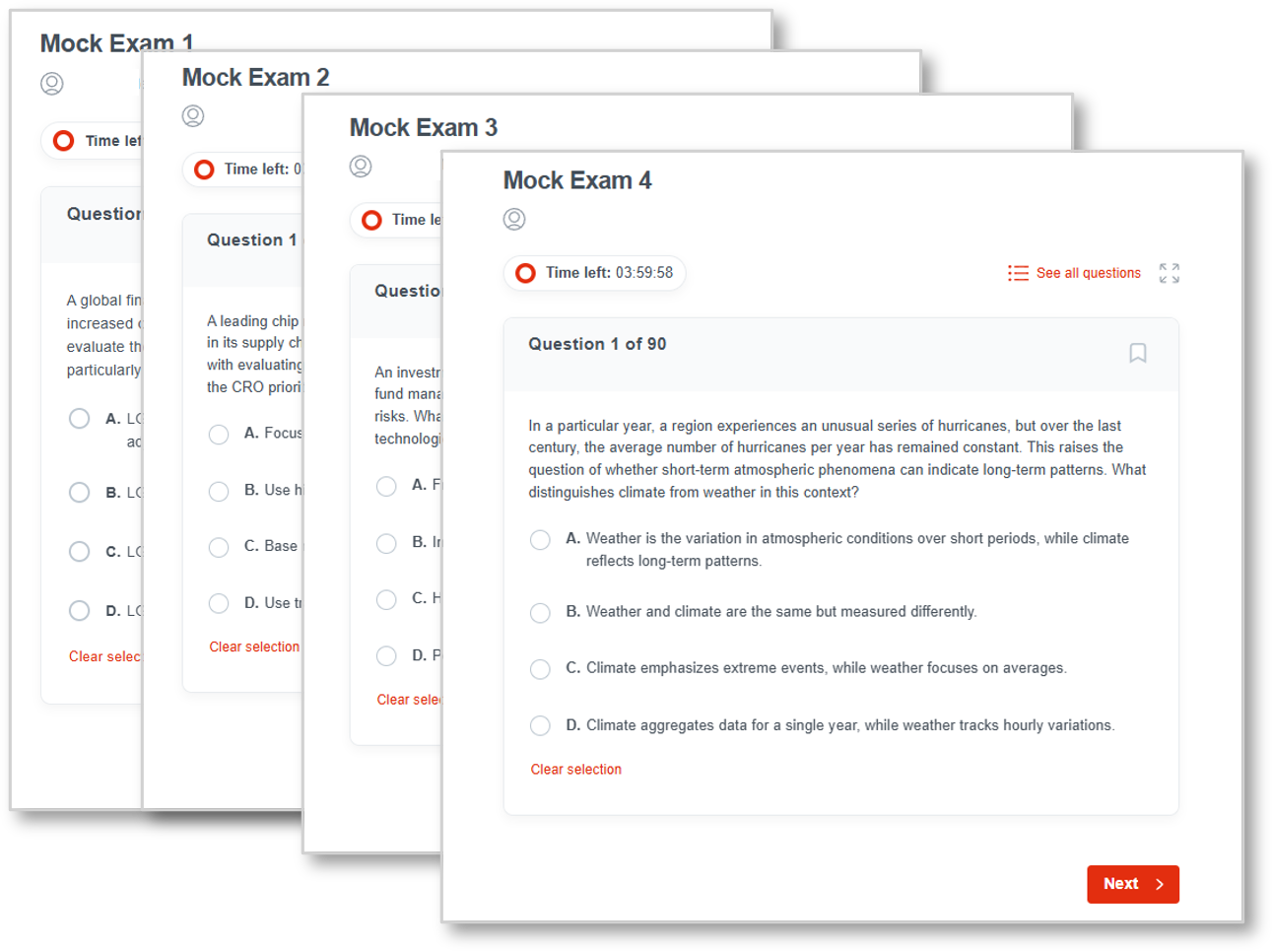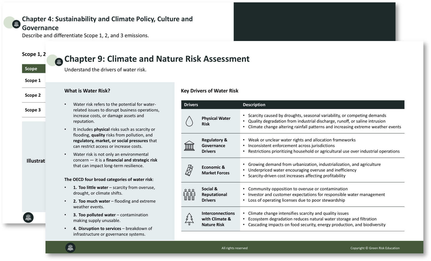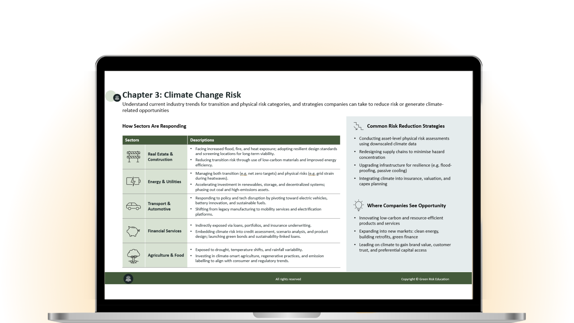 Our course is delivered through a dynamic learning experience that aligns with the official syllabus. Dive deep into the core concepts and learning objectives with engaging video lectures led by industry experts while learning exploring the intricacies of climate risk. These lectures break down complex topics into easily digestible segments, ensuring you grasp each concept with clarity.