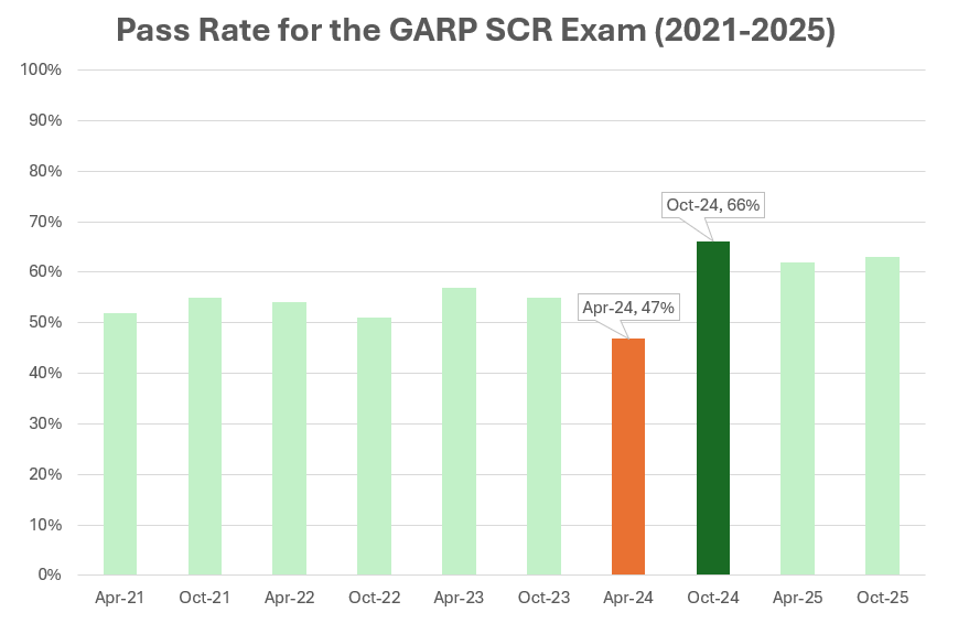 Figure showing the pass rate for the GARP SCR Exam 2021-2025, %